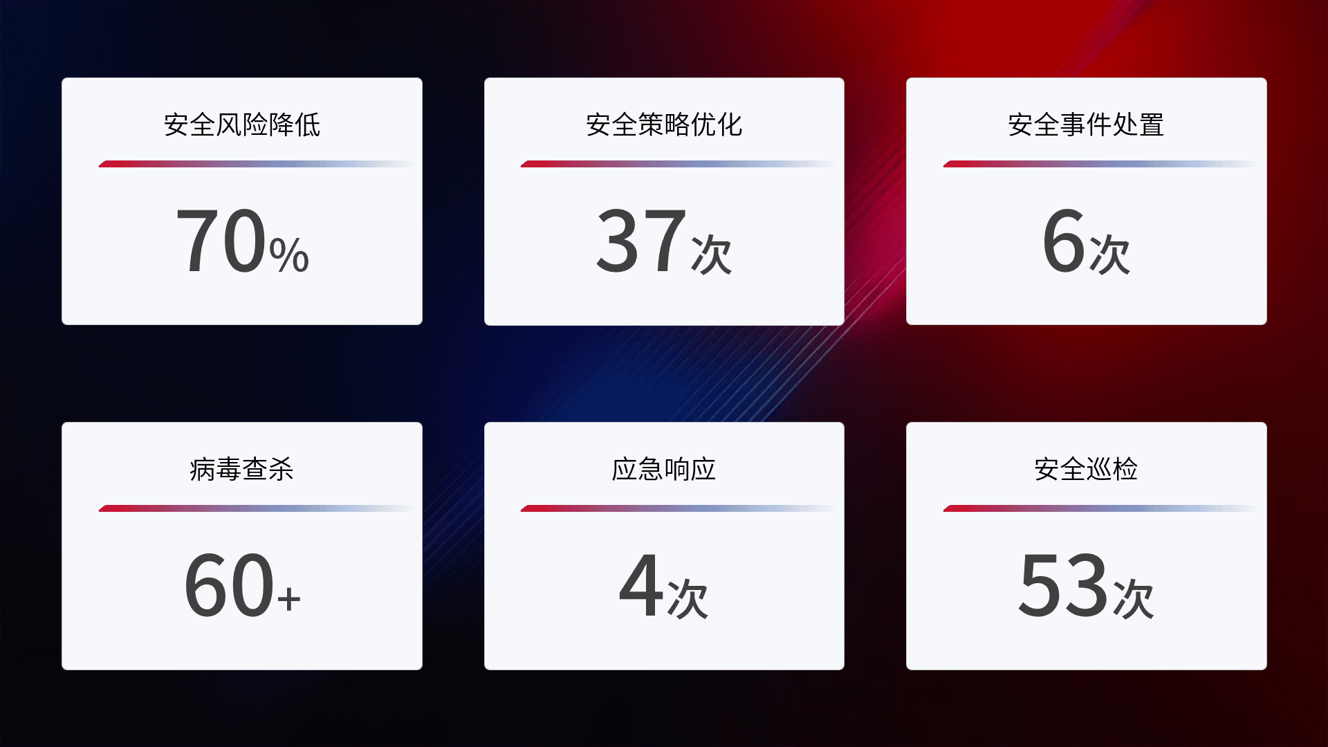 提供全面的安全事件报告体系,,,,包括处置报告、、、、周报、、、季度和年度总结,,结合持续监控,,帮助客户深入了解网络安全状况。。。